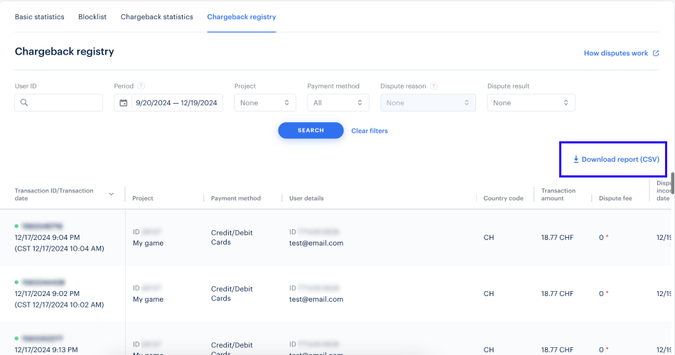 To get a report on all disputed transactions, click Download report (CSV).