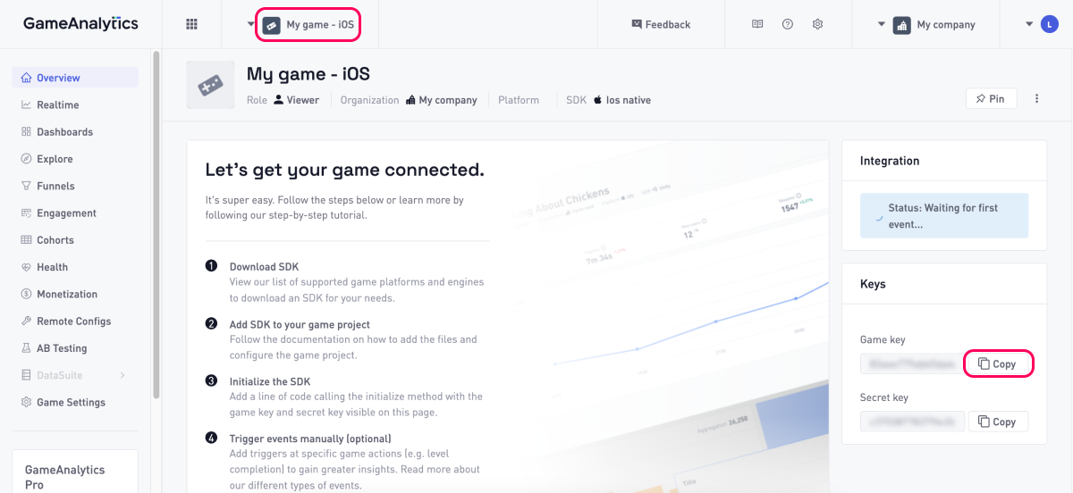 - In the GameAnalytics game key field, enter the game key. To find this information in your account in GameAnalytics: