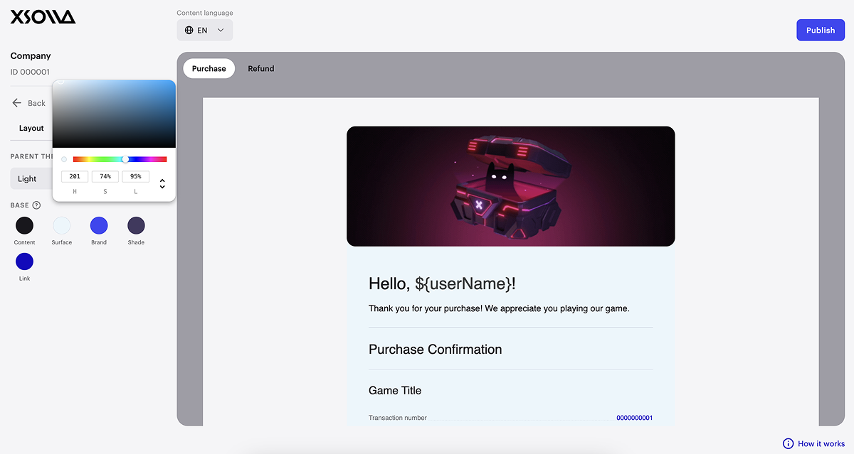 - To see how the theme looks like in emails for successful purchases and payment refunds, switch between the Purchase and Refund tabs.