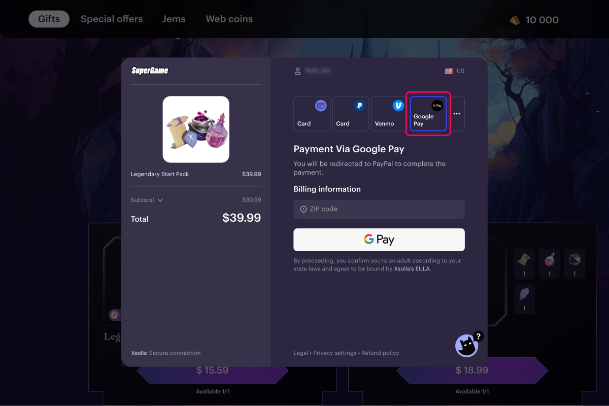 embed— in this case, the payment UI opens inside your game: the payment UI padding is cut off at the edges to fit other interface elements.