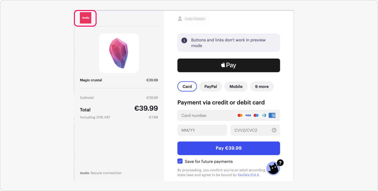 - To see how the game logo appears in the payment UI, in the Preview section, check the Show logo box. To set up the display of a game logo in the payment UI, pass the necessary parameters in the token.