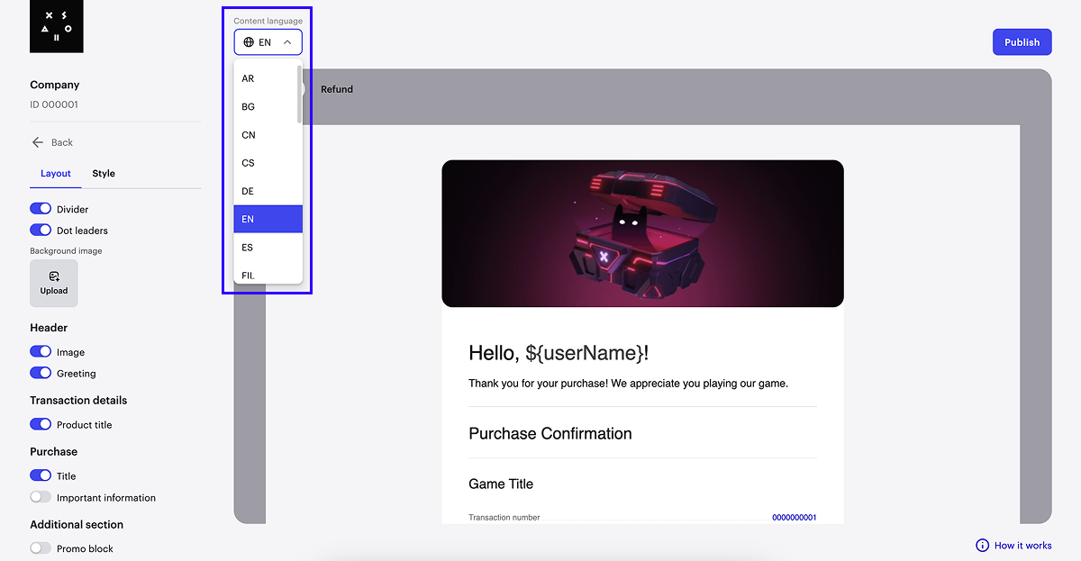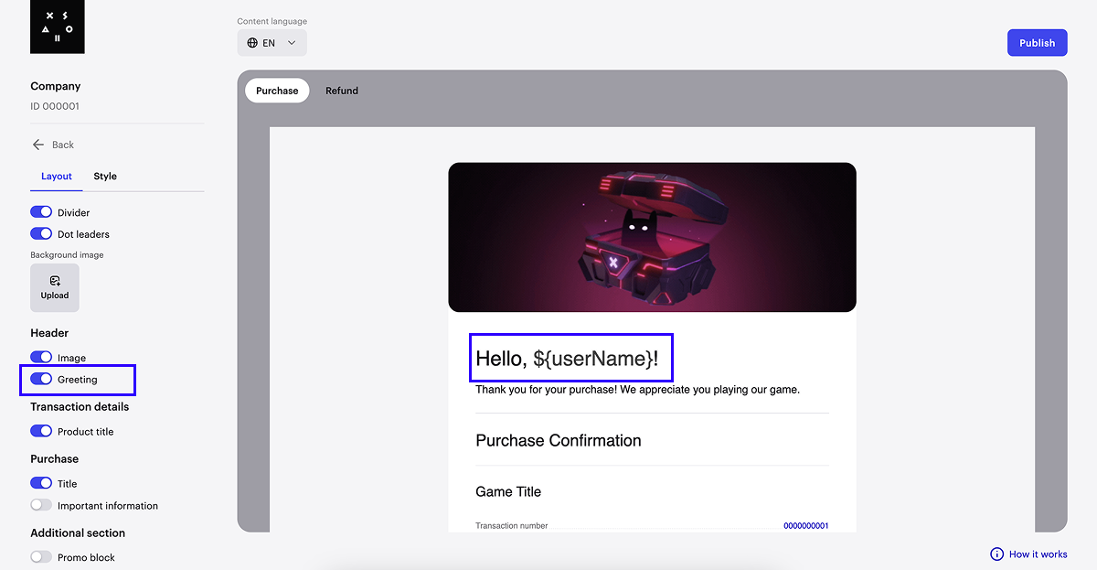 - Para ver como o tema se parece em e-mails para compras bem-sucedidas e reembolsos de pagamento, troque entre as abas Purchase e Refund.