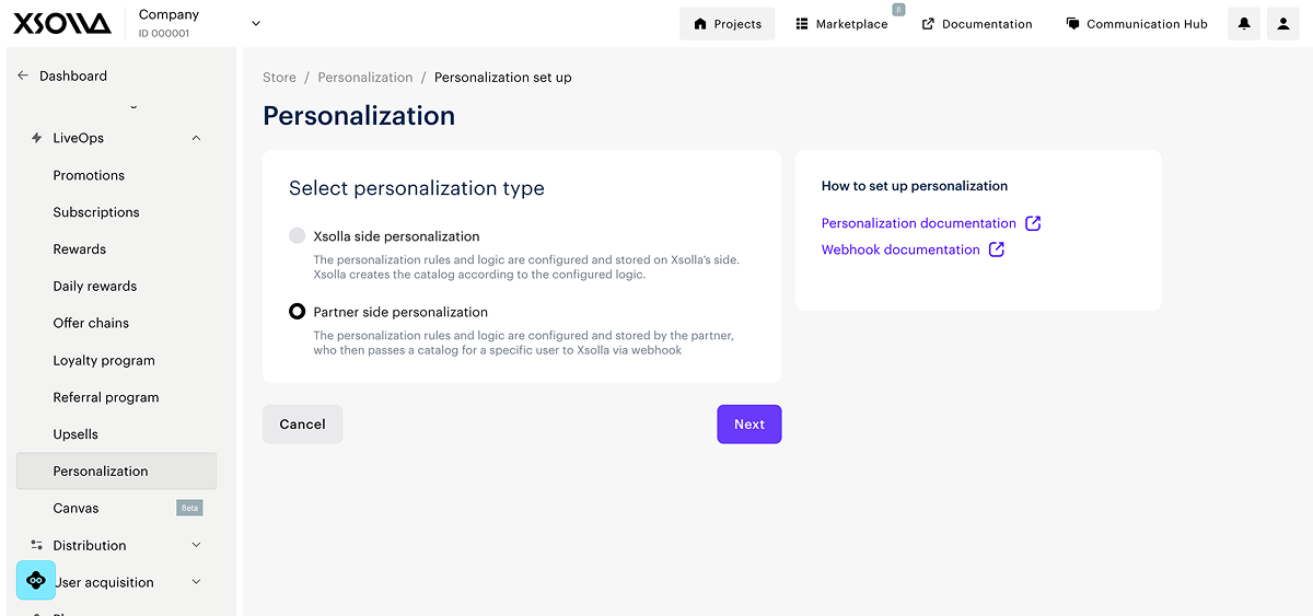 • Personalização do lado do parceiro. As regras e a lógica de personalização são configuradas e armazenadas pelo parceiro, que envia um catálogo para um usuário específico à Xsolla.