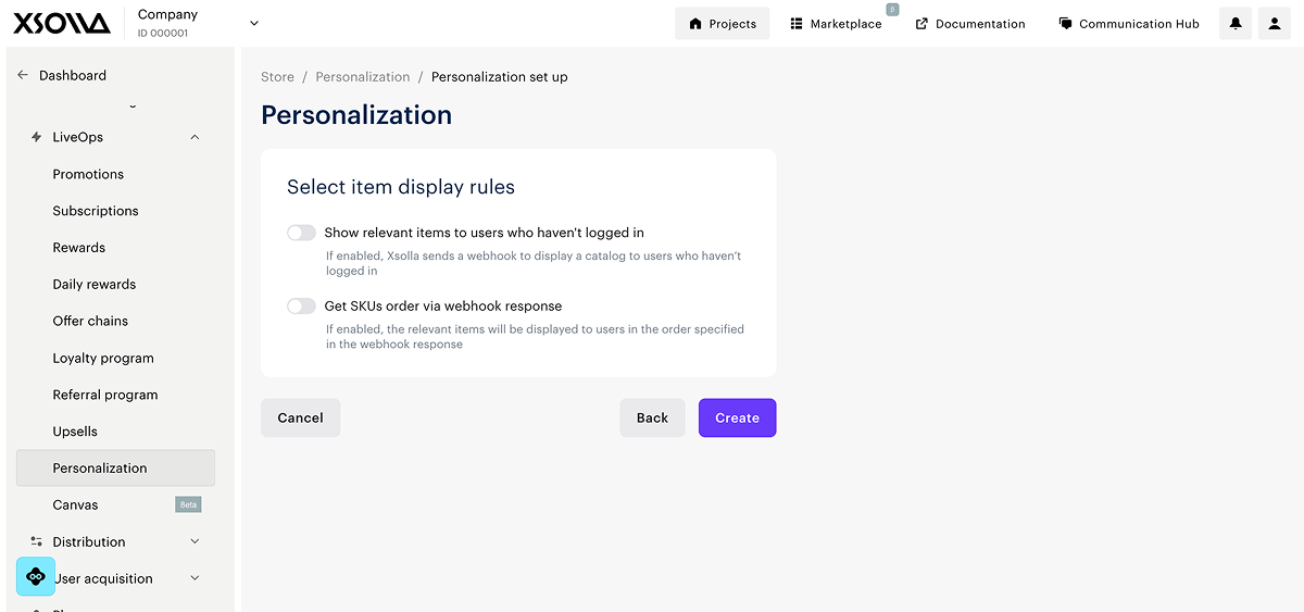 3. Defina as regras de exibição do catálogo. Você pode fazer isso ao ativar a personalização ou em um projeto na Conta de Distribuidor na seção LiveOps > Personalization > Catalog display rules.