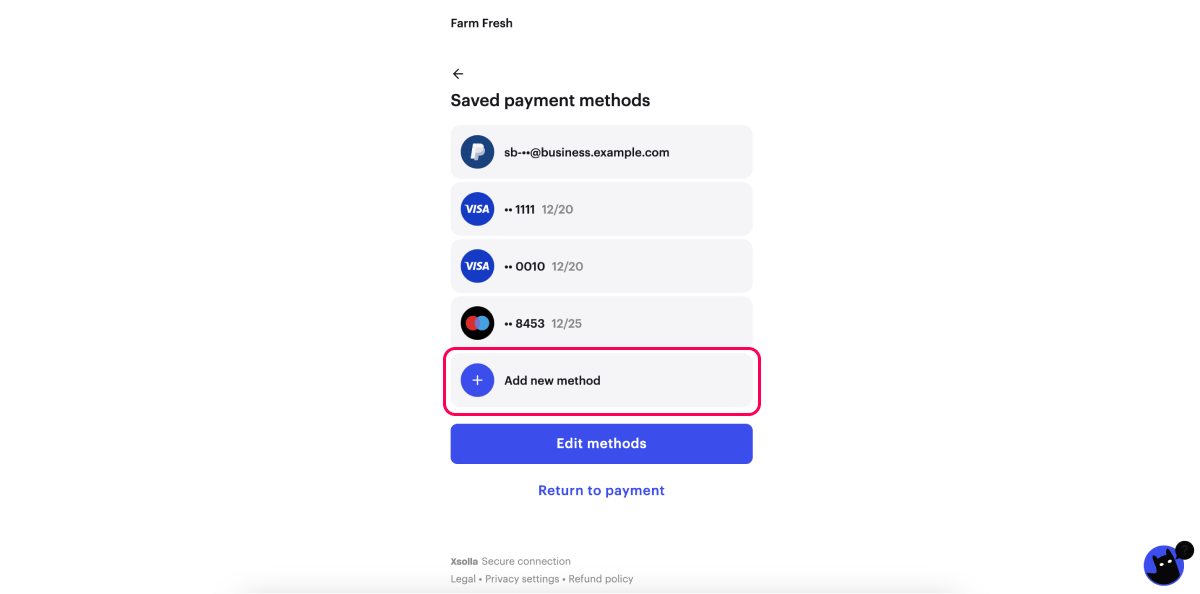 После совершения успешного тестового платежа ваш аккаунт PayPal будет сохранен в списке платежных методов.