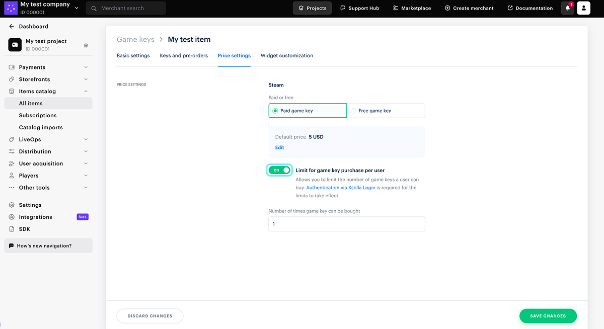 - Чтобы ограничить количество предметов, доступное для покупки, установите переключатель Ограничивать покупку предметов пользователем в положение Вкл и введите необходимое число.