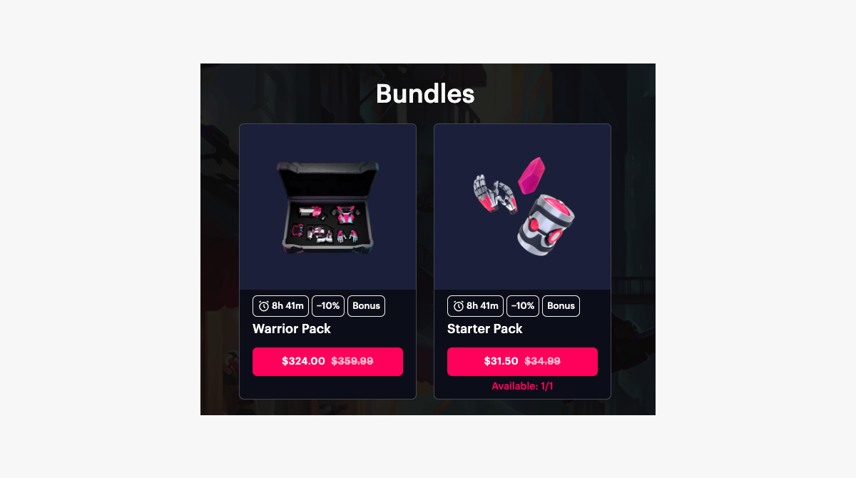 Вы можете создать приветственный бандл с ценными товарами, который будет доступен к покупке для любого пользователя только один раз или только для пользователей, у которых еще нет покупок. Вы также можете ограничить время, в течение которого бандл будет доступен для покупки.