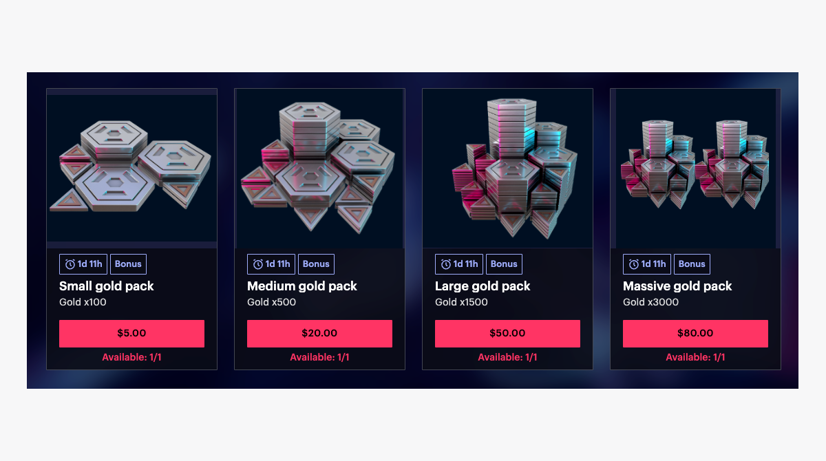 В магазине отображается 4 пакета виртуальной валюты с бонусом. Бонусом является пакет виртуальной валюты, аналогичный купленному.