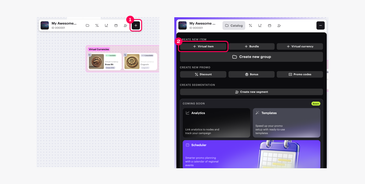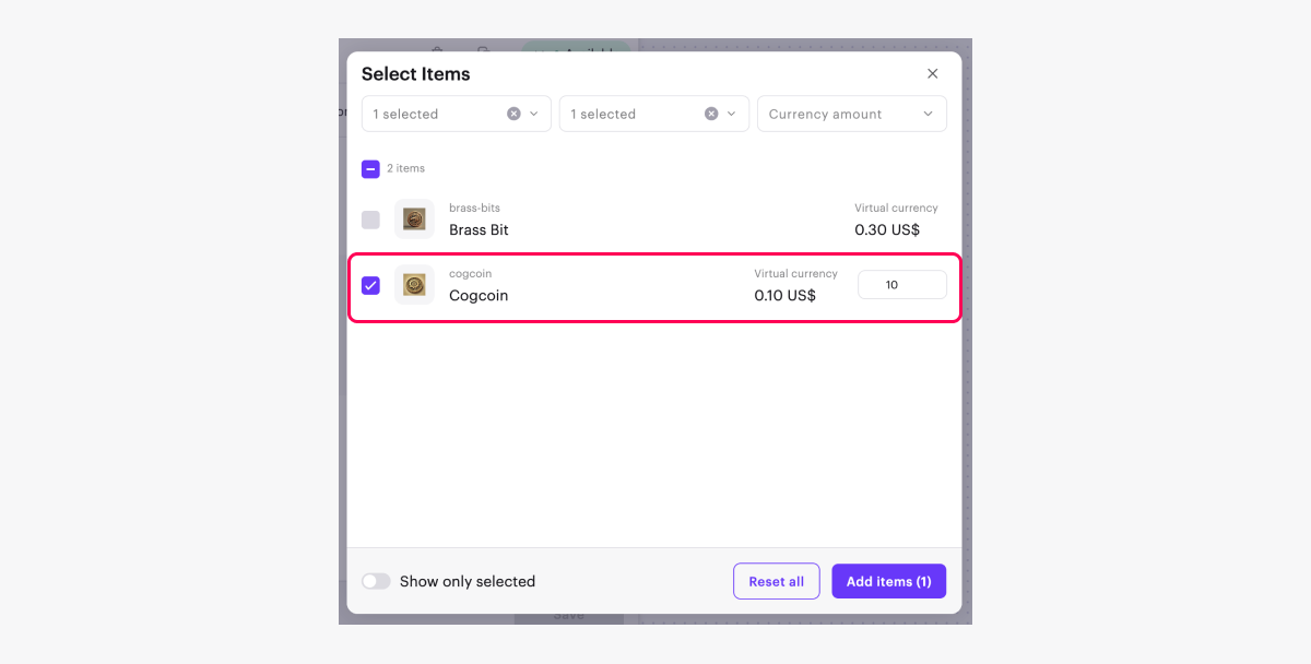 Virtual currency is virtual money that is used for purchasing and selling in-game items. Depending on its purpose, a virtual currency affects the game economy balance or is connected to the monetization of the application. You can also create hard currency — a virtual currency that is linked to the platform of purchase and can be purchased only for real money.