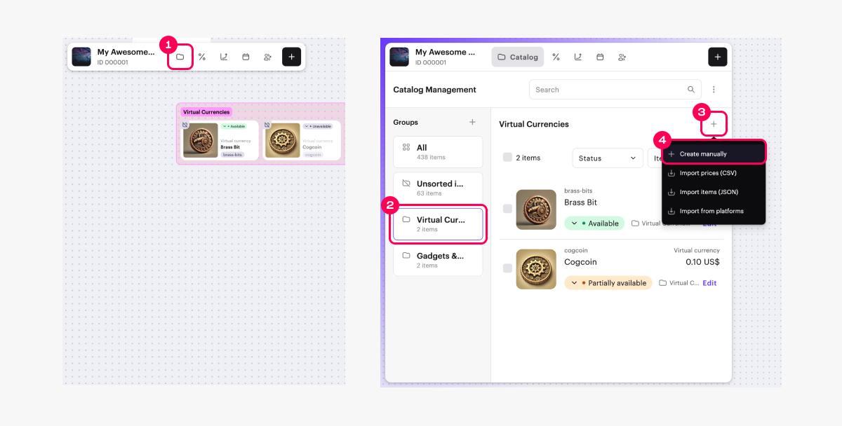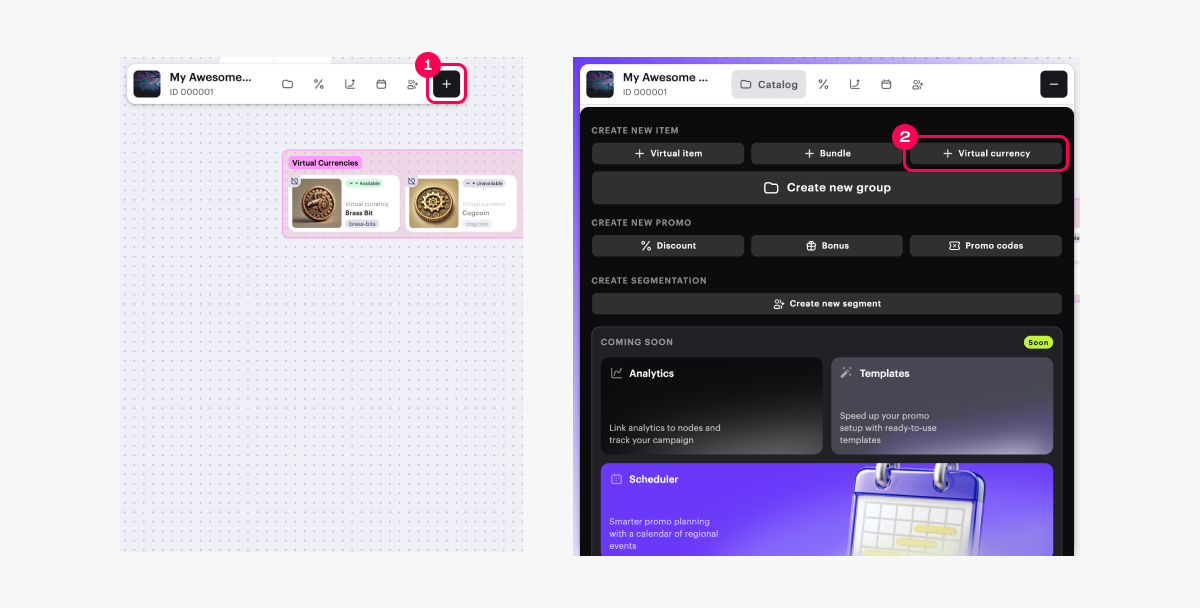 - Option 2: In the toolbar, click the + icon and select Virtual currency.