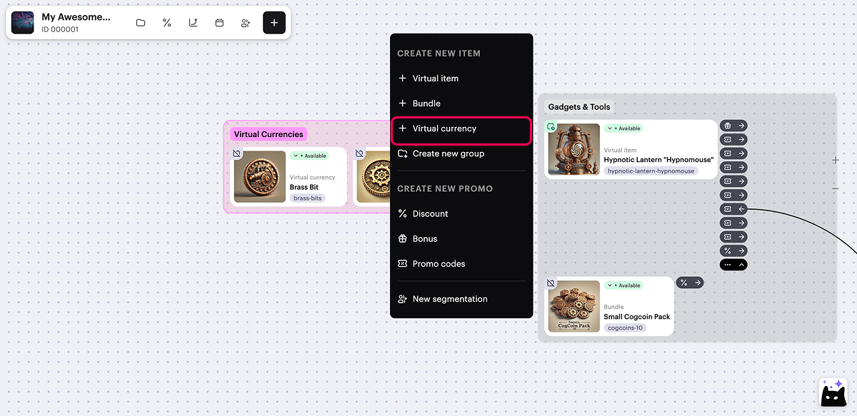 - Option 3: Open the context menu anywhere on the canvas and select Virtual currency.