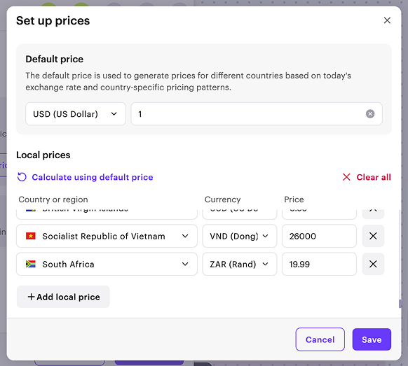 - To set prices automatically, click Calculate using default price. A list of countries will be generated in alphabetical order, and the price in the regional currency will be calculated for each country based on exchange rates and taxes. You can edit or remove these prices.