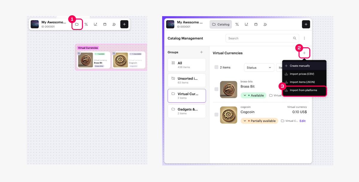 - make changes to the catalog using API endpoint groups for managing bundles, virtual items and currencies.