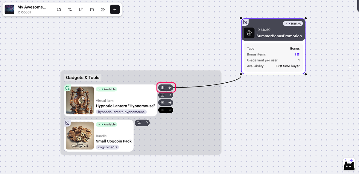 On the canvas, a visual link is shown between the promotion card and the promotional item.