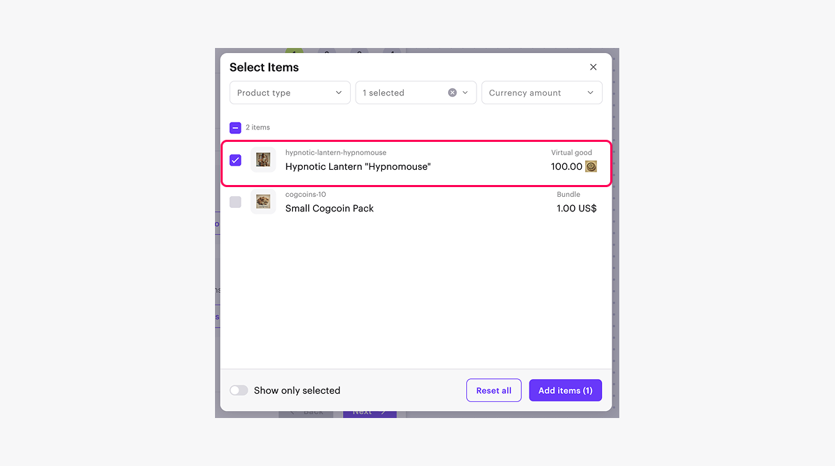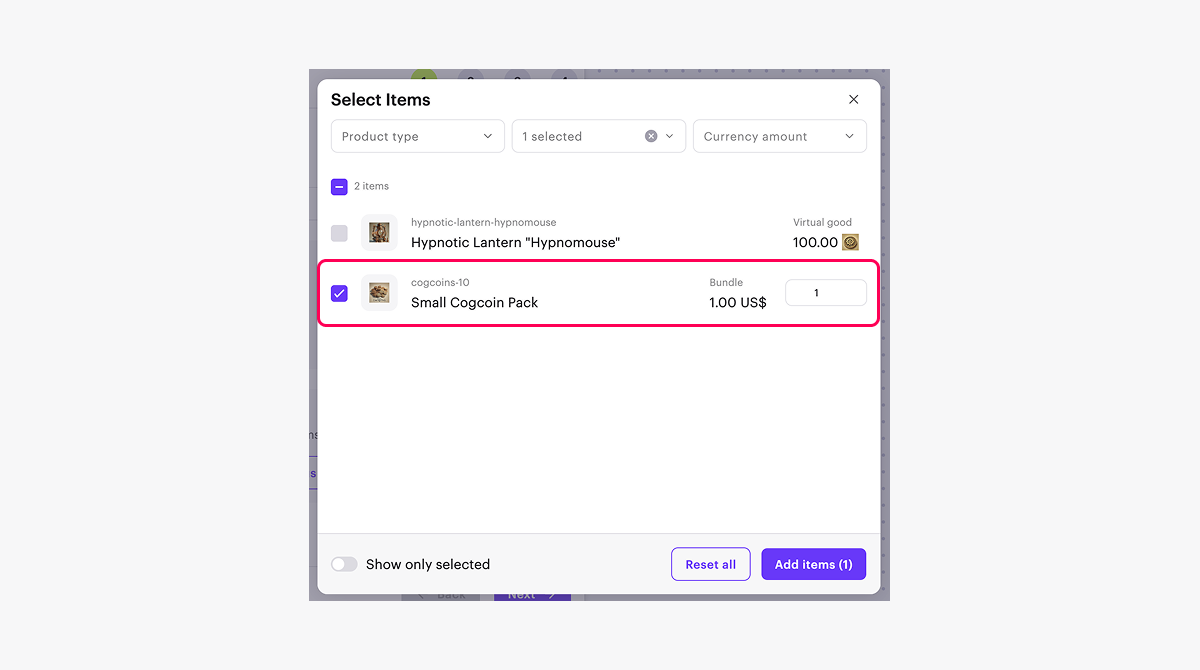 - In the Bonus items field, click Select items.