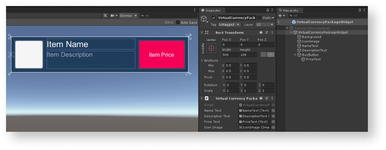 VirtualItemWidget, наследуемый от стандартного класса MonoBehaviour. - Объявите переменные для элементов интерфейса виджета бандла и присвойте им значения в панели