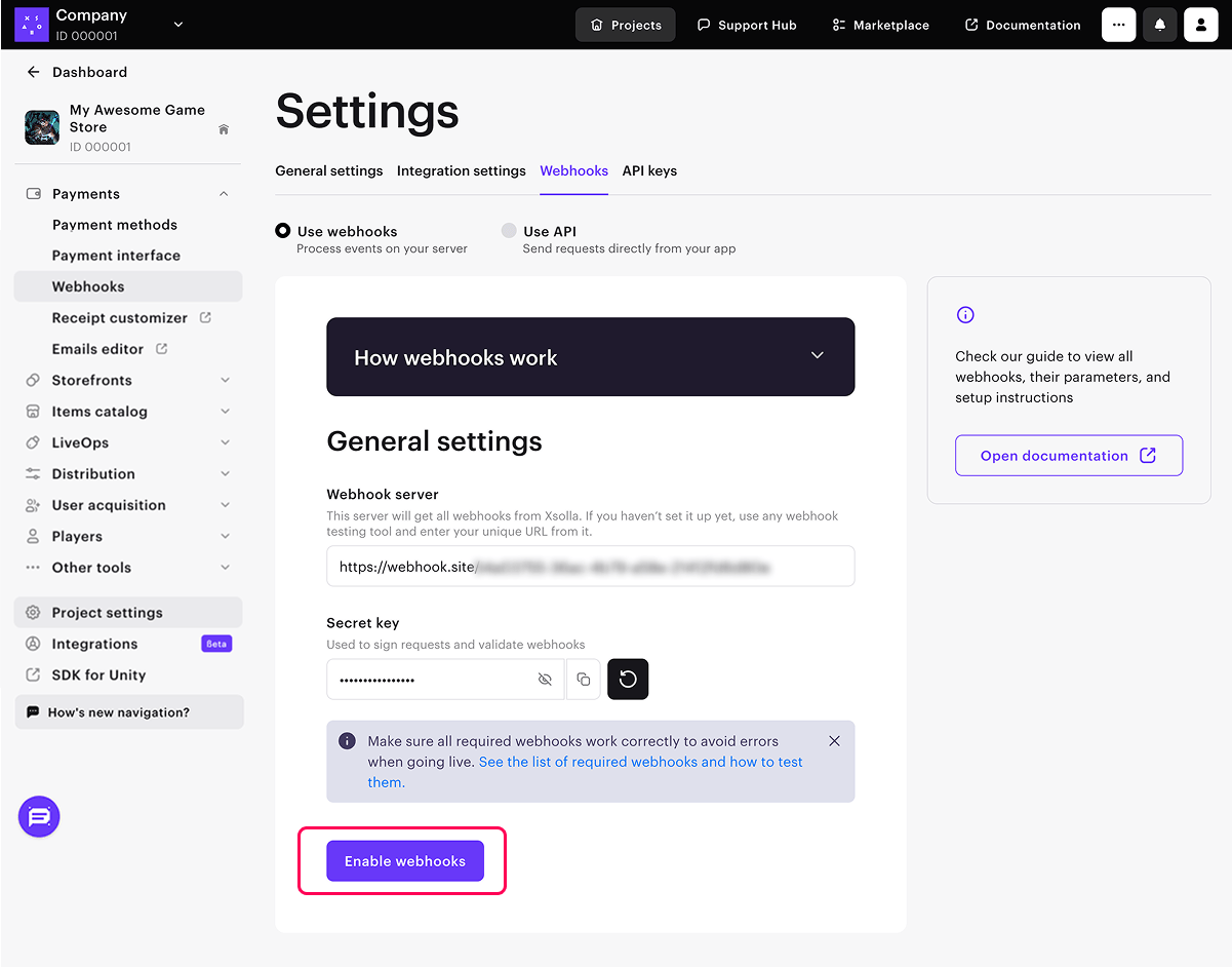 - В проекте в Личном кабинете перейдите в раздел Настройки проекта > Вебхуки.