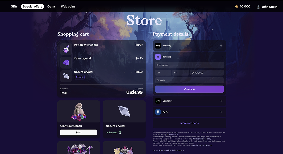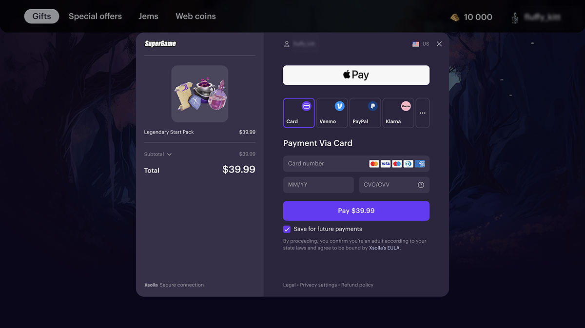 Xsolla Headless checkout is the SDK for creating a custom payment UI to accept payments without using Xsolla Pay Station. You can open the payment UI in a WebView or browser. All SDK components are fully customizable: you can select their styles and layout order.