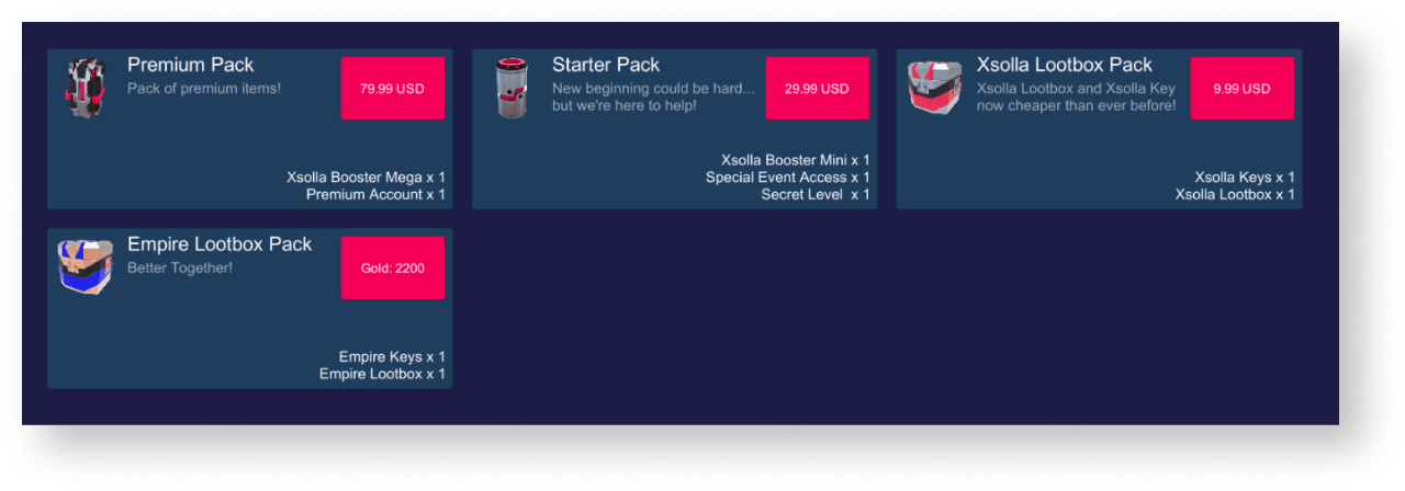 The logics and interface in the examples are less complicated than they will be in your application. A possible item catalog in an in-game store implementation option is described in the demo project.