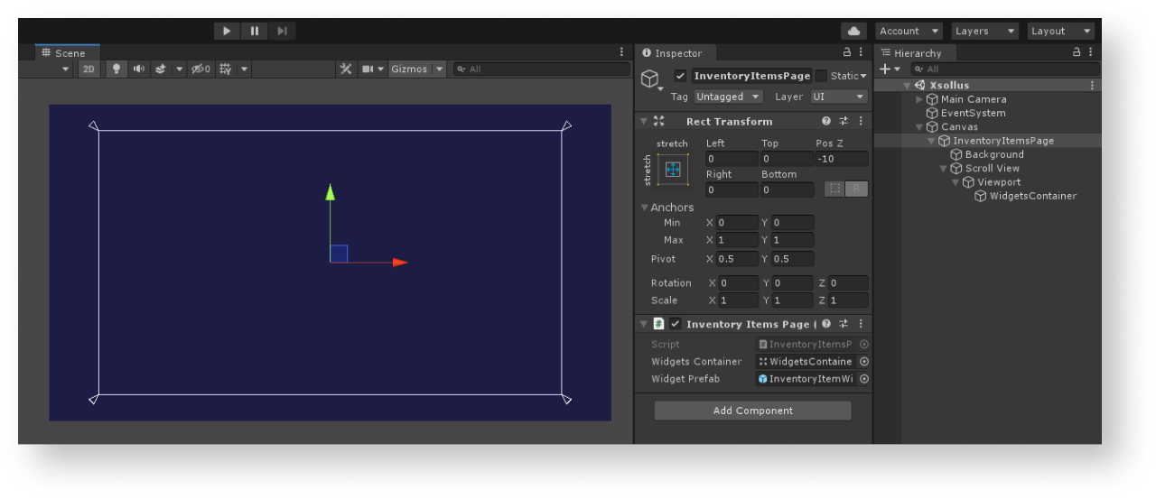 Inspector panel, clickAdd Component and select anInventoryItemsPagescript.