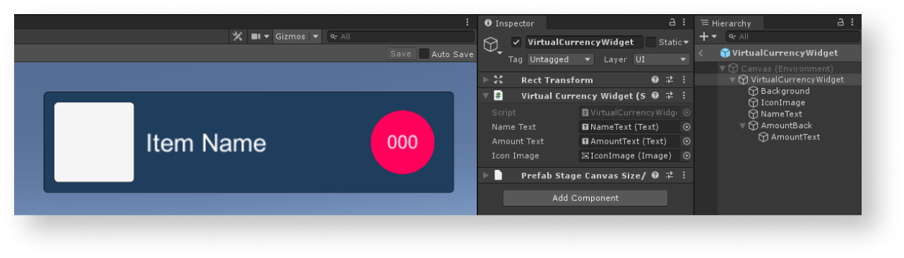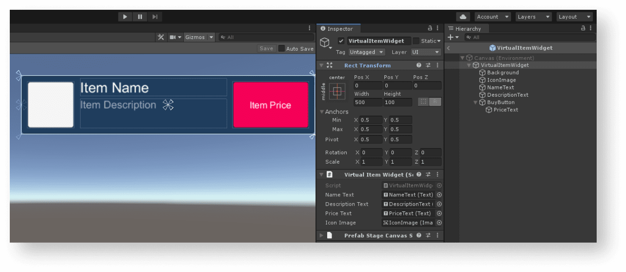 VirtualItemWidgetinherited from the MonoBehaviour base class. - Declare variables for the item widget interface elements and set values for them in the