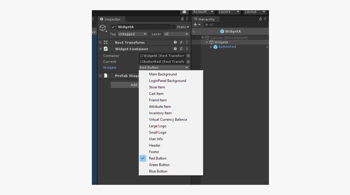 For the WidgetA object, the widget with the Red Button ID is specified in the example. As a result, the WidgetA object will be created using a prefab specified for the Red Button widget in the editor.