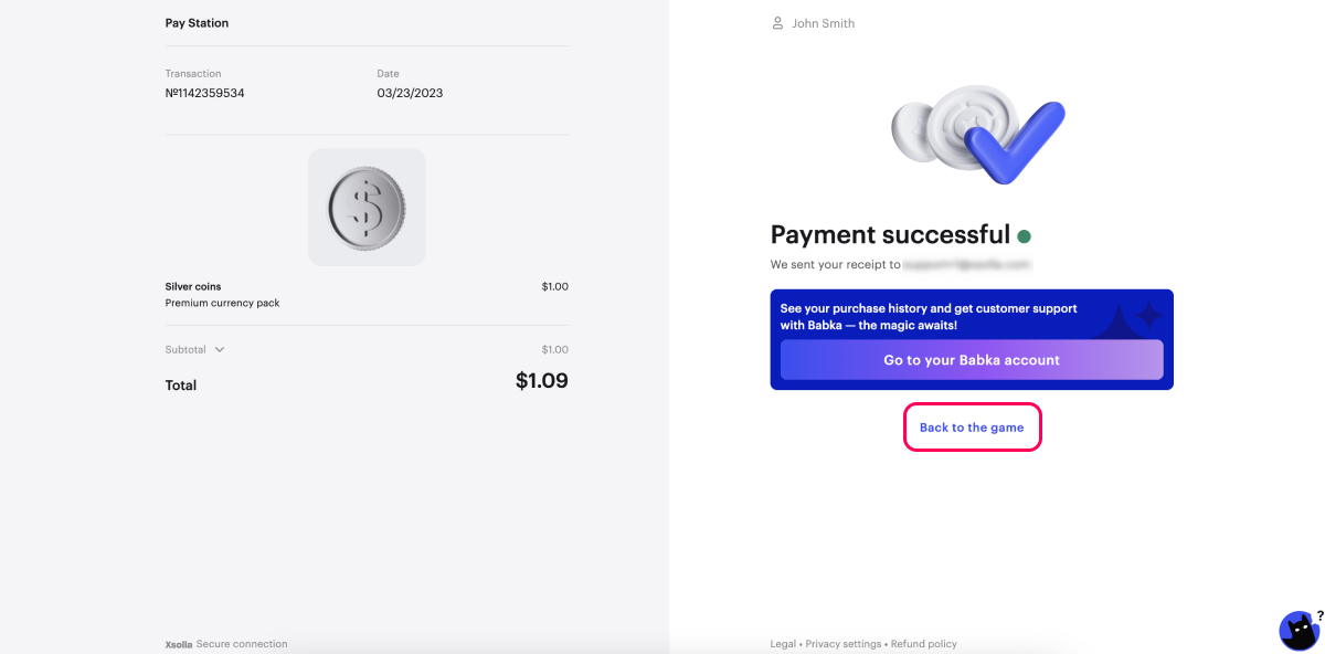 To test the purchase process, you can use sandbox mode of payment UI and test bank cards. The sandbox mode only simulates the behavior of a payment method; no real money is involved. To try sandbox, you don’t need to sign any agreements with Xsolla or pay any fees.