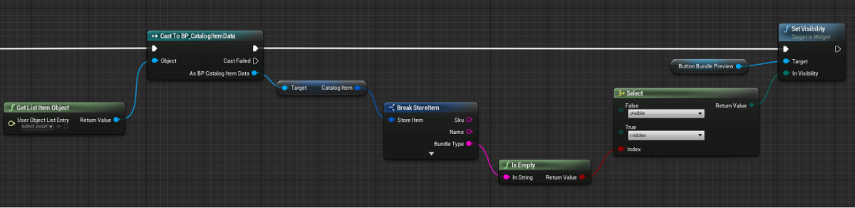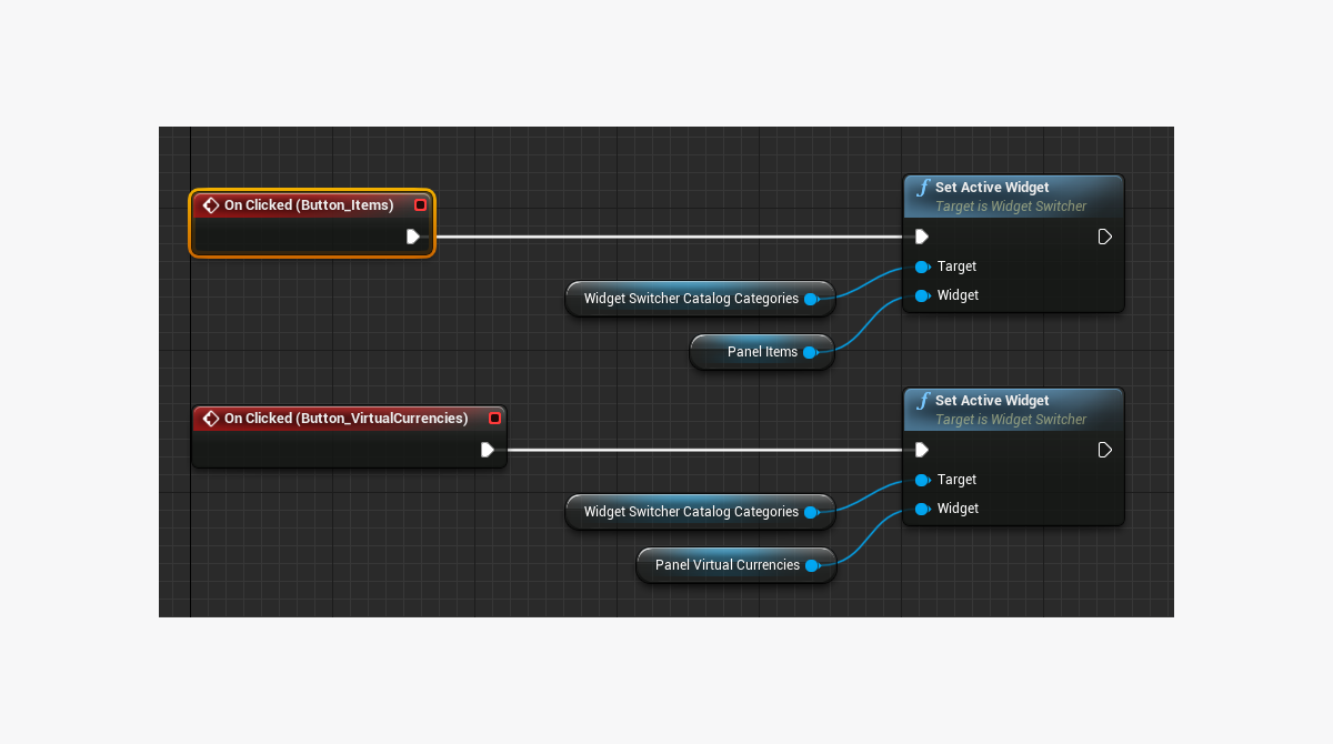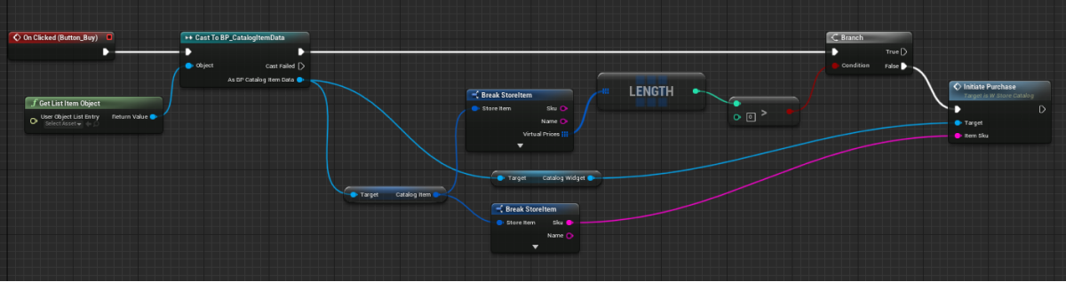Graph view. - Implement logic for clicking a button for purchasing an item. To do this, add the nodes as shown in the following picture.