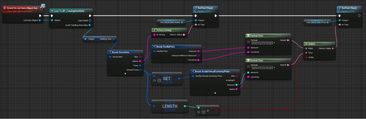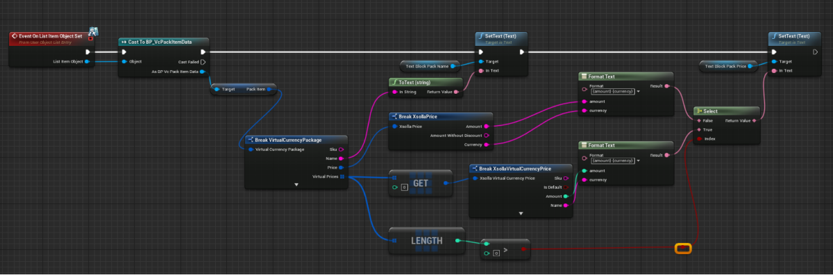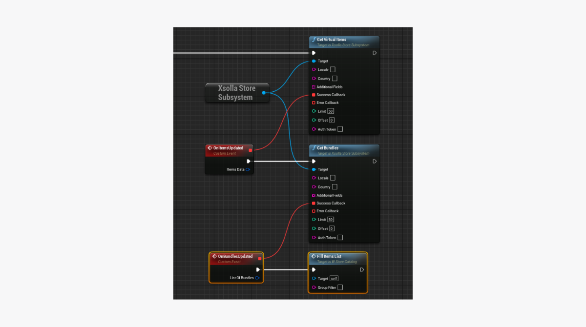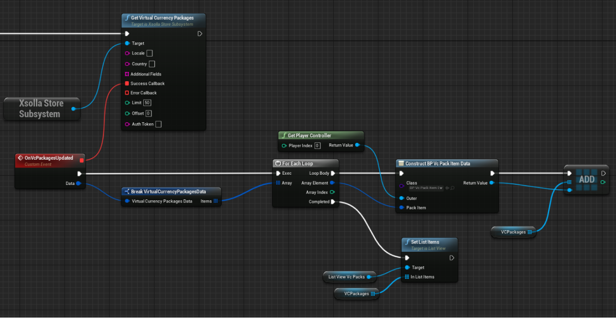 GetVirtualCurrencyPackagemethod call connected with theXsollaStoreSubsystemobject to theEventConstructnode and add passing of data entered by users. - Implement logic for adding a package to the list. The action should be done while processing a successful update of virtual currency packages. To do this, add nodes as shown in the following picture.