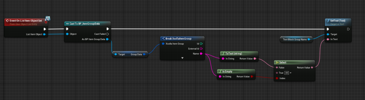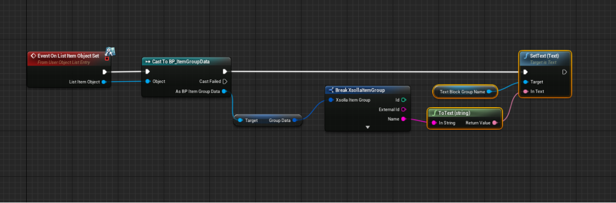 OnListItemObjectSetnode to create an element of the list and initialize the widget. - Pass the value from the object that contains data about the item to the element with the name of the item. To do this, add nodes as shown in the following picture.