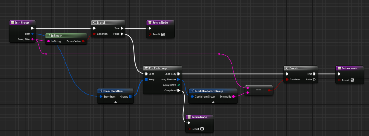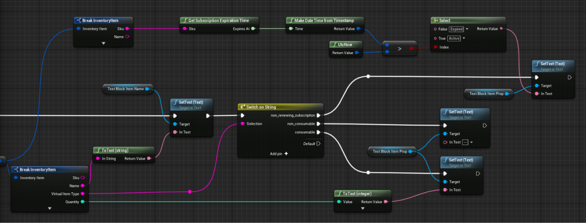 - Implement logic for defining an item type by passing the data about the item according to its type to the element with the item features. To do this, add nodes as shown in the following picture.