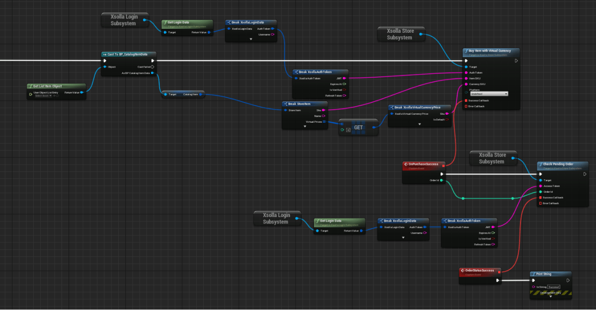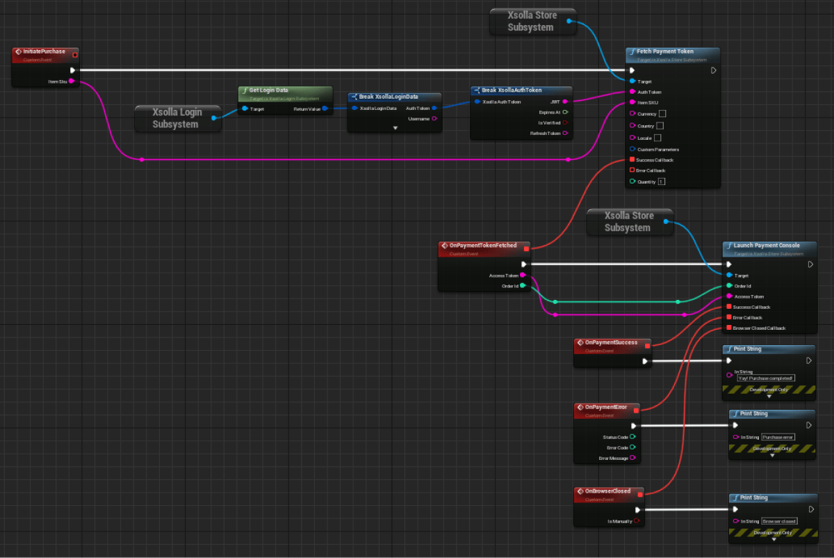 InitiatePurchasenode and connect theFetchPaymentTokenSDK method call linked to theXsollaStoreSubsystemobject to the added node. - To the