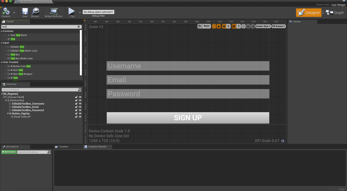 Content Browser and open aUI directory. In the contextual menu, go toUser Interface > Widget Blueprint . - In the widget blueprint, add the following interface elements: