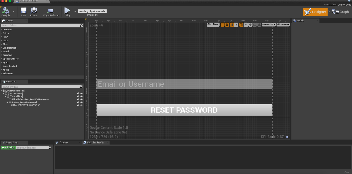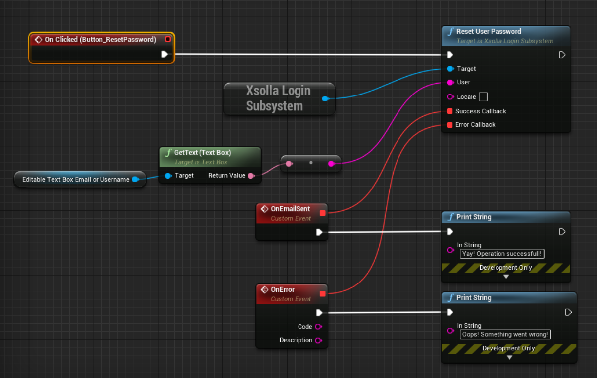 ResetUserPasswordmethod call on theXsollaLoginSubsystemobject to theOnClickednode and add passing of data entered by users. - Add the