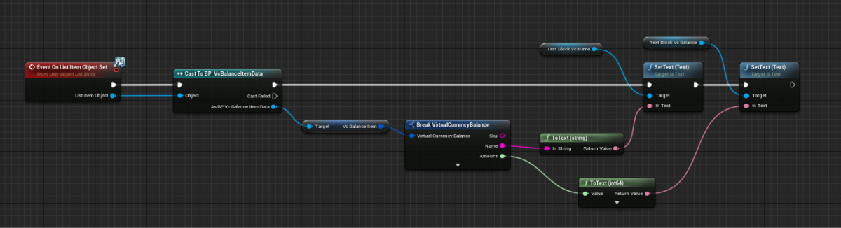 EventOnListItemObjectSetnode to create a list element and initialize the widget. - Pass the values from the object that contains data about the virtual currency to the elements with the name of the virtual currency and its quantity. To do this, add nodes as shown in the following picture.