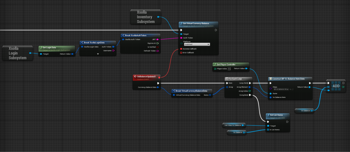 GetVirtualCurrencyBalancemethod call connected with theXsollaInventorySubsystemobject to theEventConstructnode. - Implement logic for filling out the list of virtual currencies. The action should be done while processing a successful update of the virtual currency balance. To do this, add nodes as shown in the following picture.
