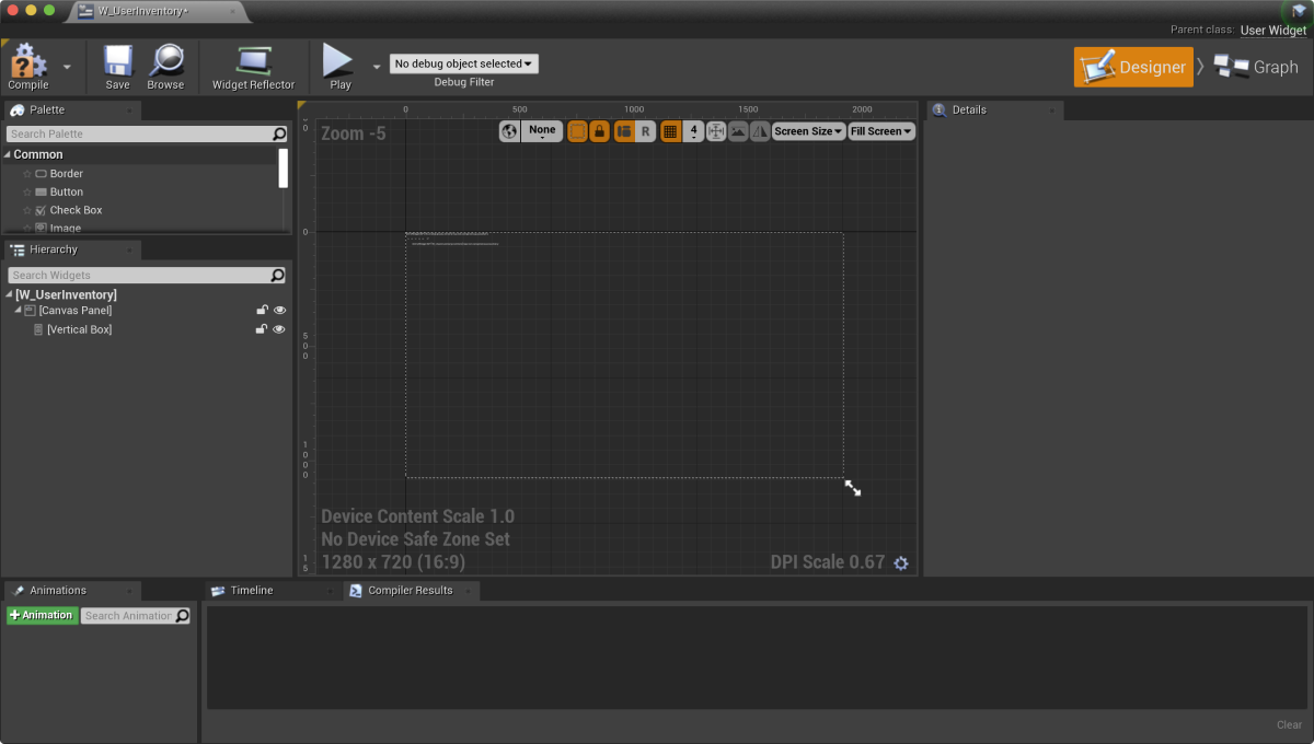 Content Browser and create aUI directory and, in the contextual menu, go toUser Interface > Widget Blueprint . - In the widget blueprint, add the following UI elements: