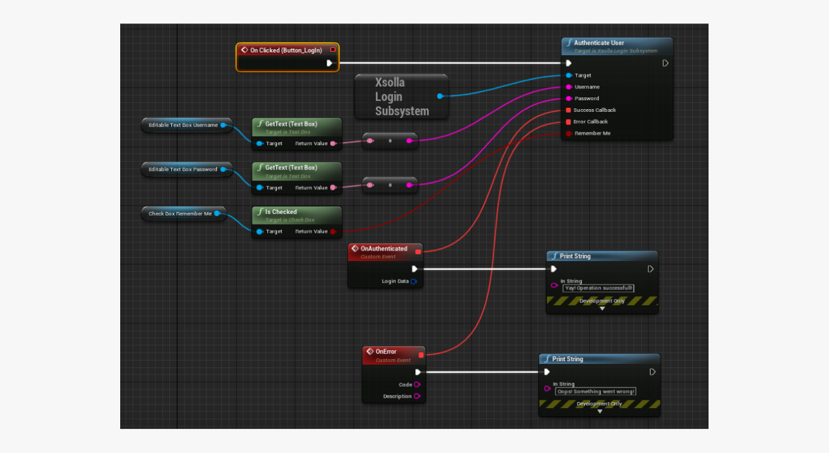 AuthenticateUsermethod call on theXsollaLoginSubsystemobject to theOnClickednode and add passing of data entered by users. - Add the