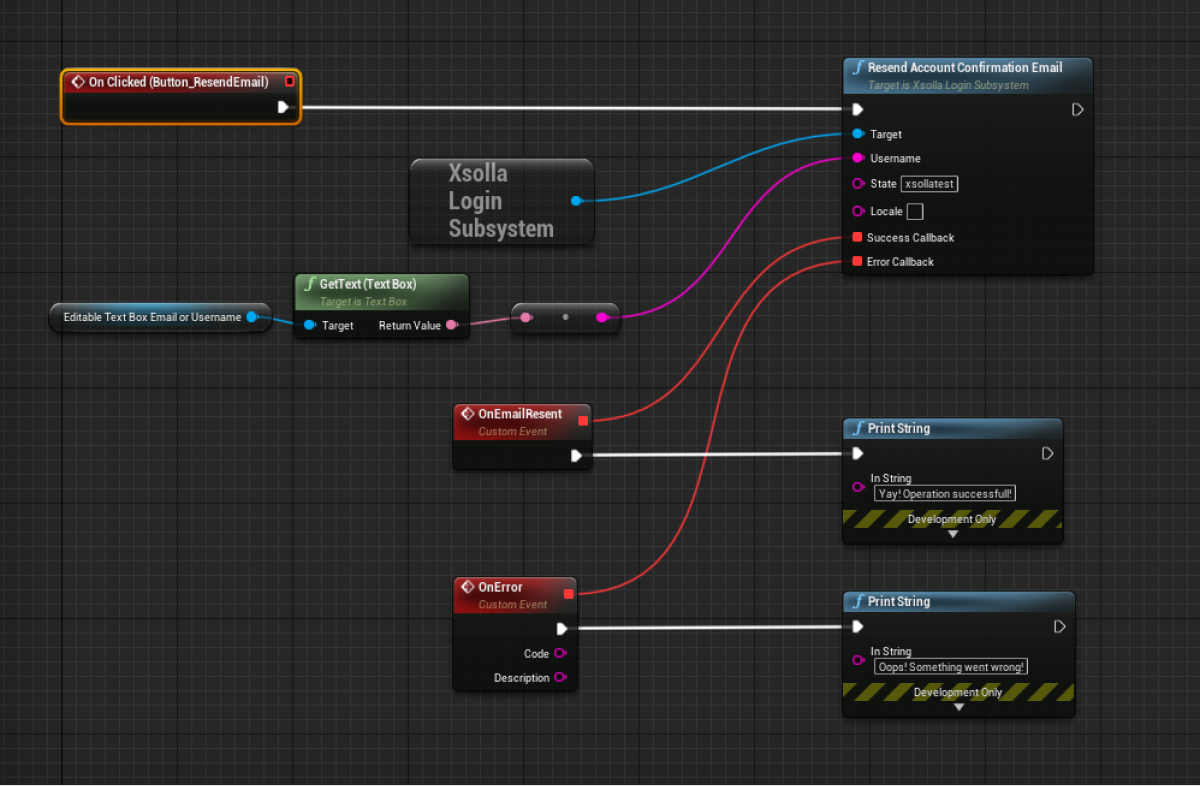 ResendAccountConfirmationEmailmethod call on theXsollaLoginSubsystemobject to theOnClickednode and add passing of data entered by users. - Add the