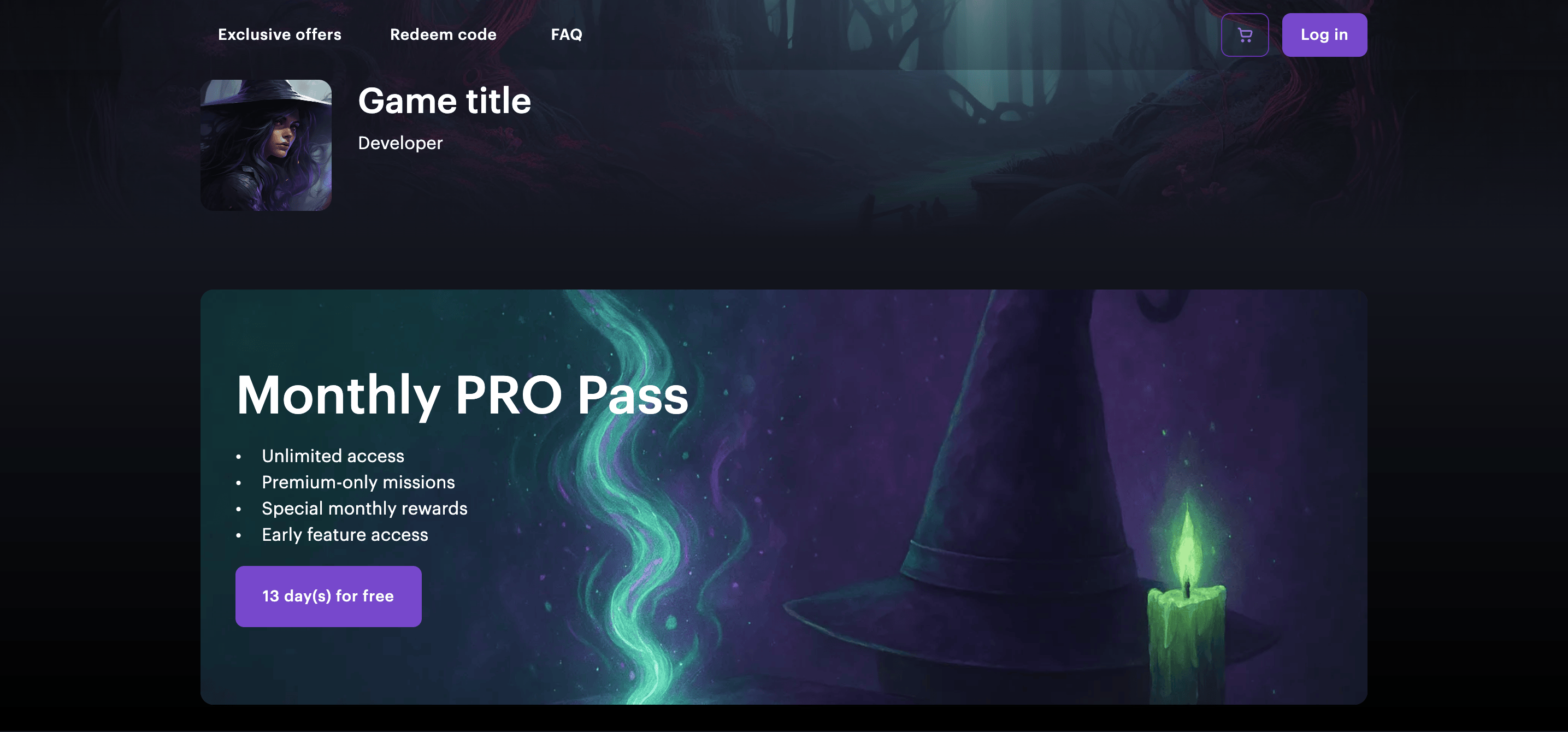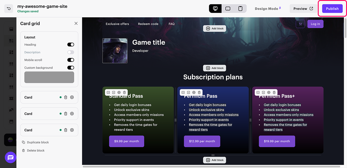 To add subscription sales, you need to add a button to your site and configure the Purchase subscription action for it. You can use customizable buttons in the Header, Card grid, and Game editions blocks.