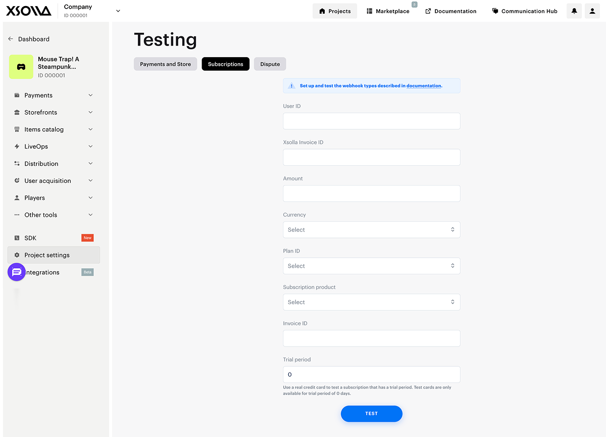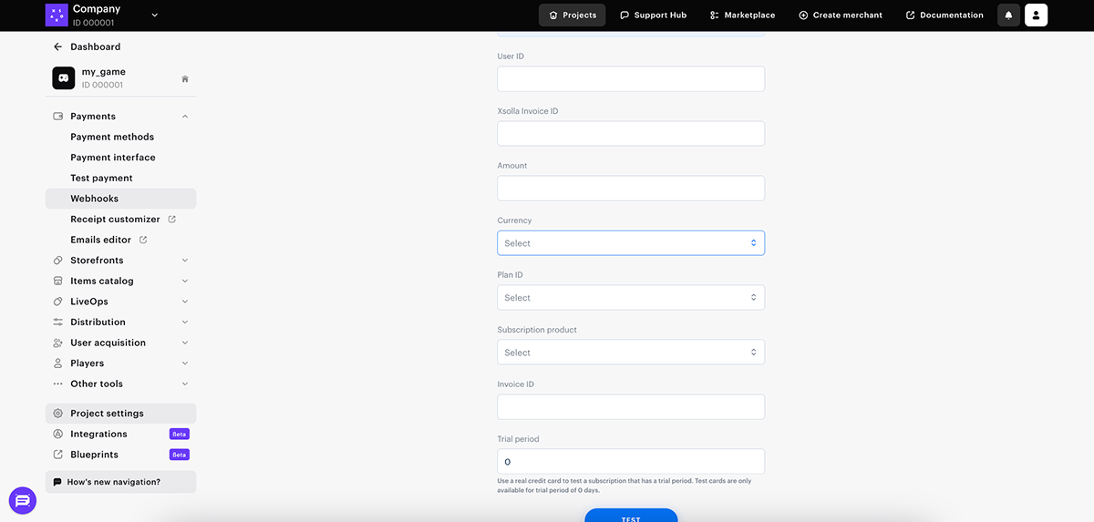 - To test webhooks, specify values from your project (User ID, Invoice ID) to be sent in a request to the webhook URL you provided. In the absence of real values, you can enter arbitrary values. Complete the following form fields: