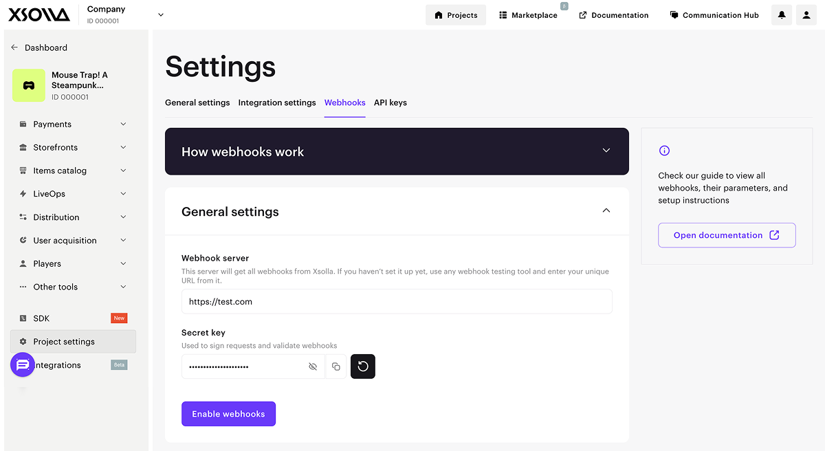 - In the project in Publisher Account go to Settings > Webhooks section.