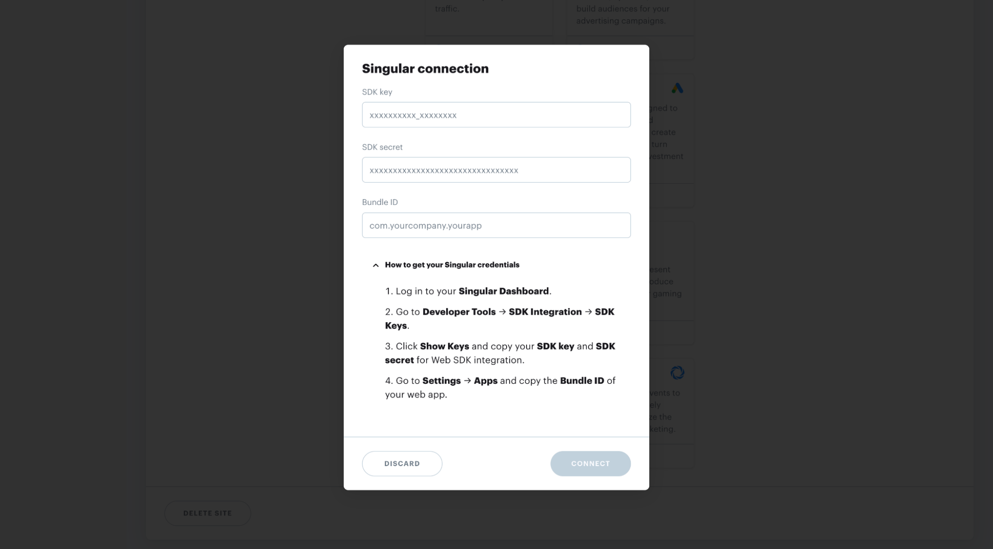 Component used in conjunction with the Singular SDK key to initialize and authenticate the Singular SDK within an application. This secret, along with the SDK key, allows the SDK to communicate securely with the Singular platform and correctly attribute application installations, events, and other data for marketing analytics.