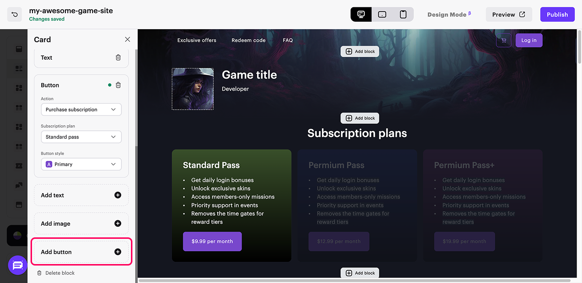 To add subscription sales, you need to add a button to your site and configure the Purchase subscription action for it. You can use customizable buttons in the Header, Card grid, and Game editions blocks.