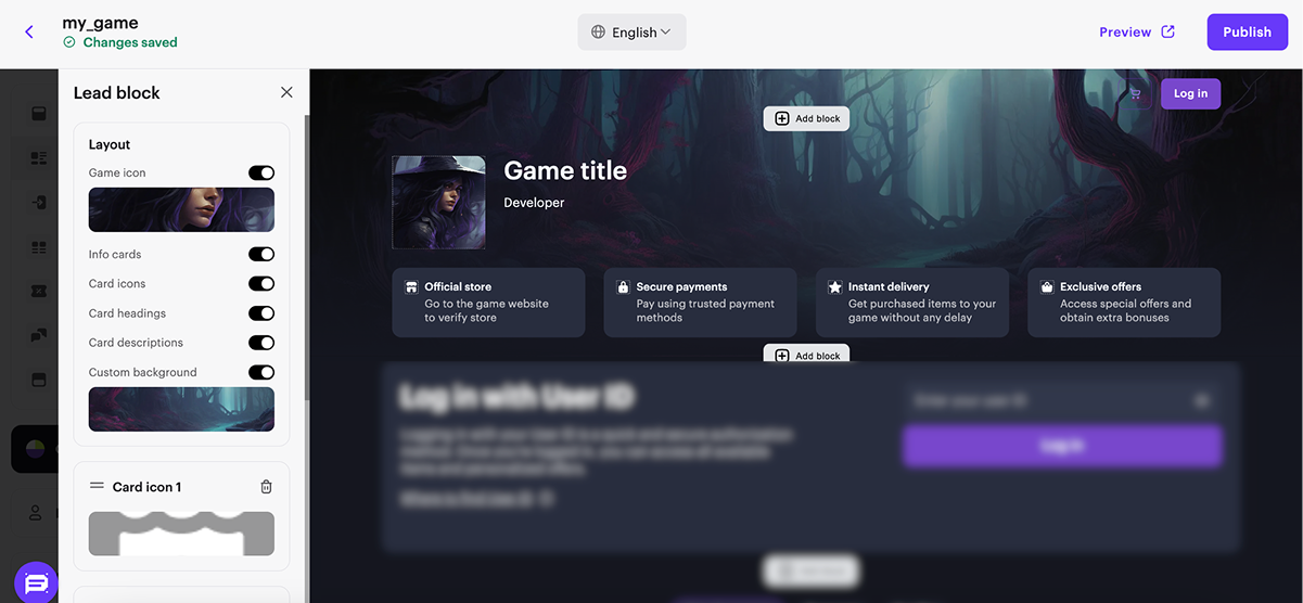 Block with basic information about your Web Shop - the game the site is created for and who the developer is. If you didn’t add a link to Google Play or the App Store when creating the site, configure the following elements of Lead block in the main part of the constructor: