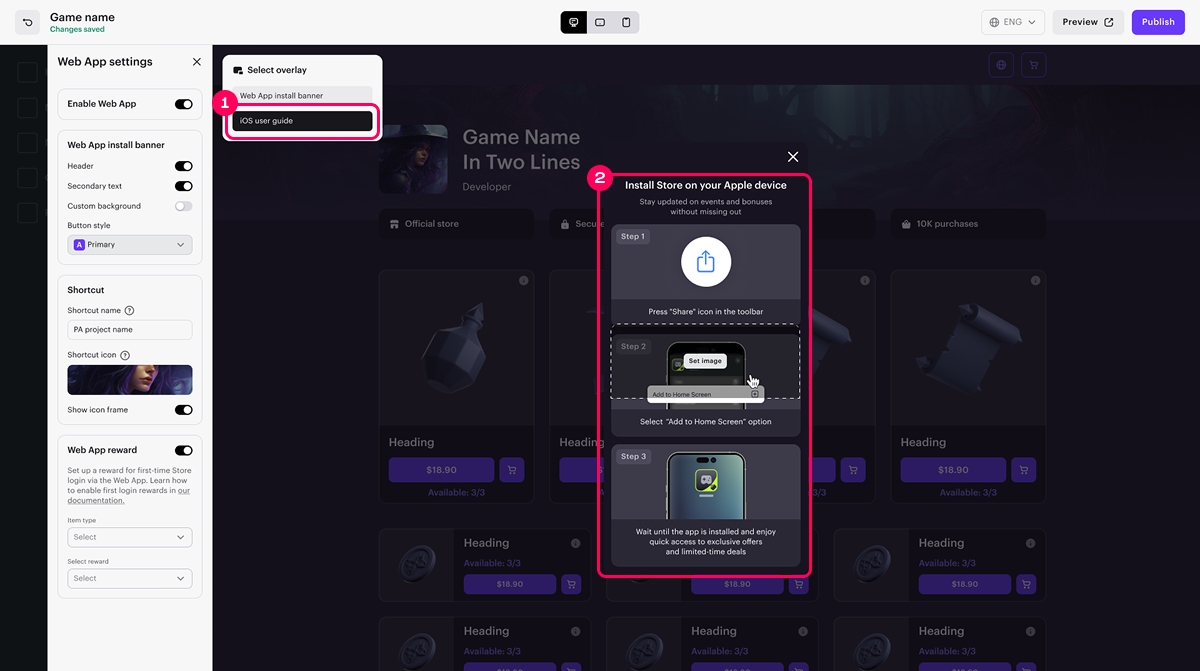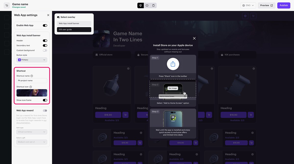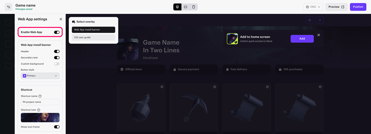 If the PWA uses the same icon as your game, we recommend setting the Show icon frame toggle to active. This will add a frame around the store icon, making it easier for users to distinguish it from the game.