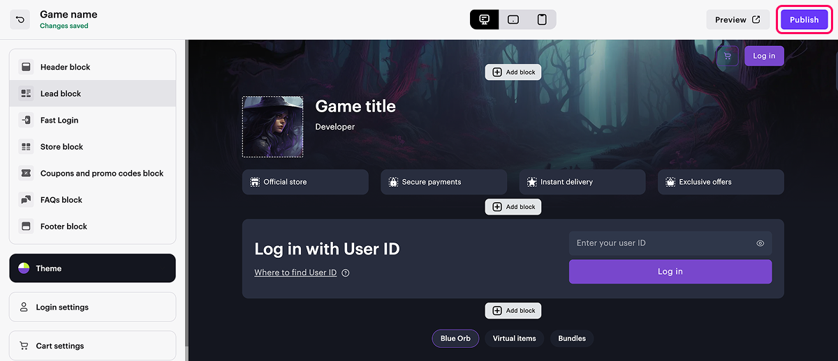- Open your project in Publisher Account and go to the Storefronts > Websites section.