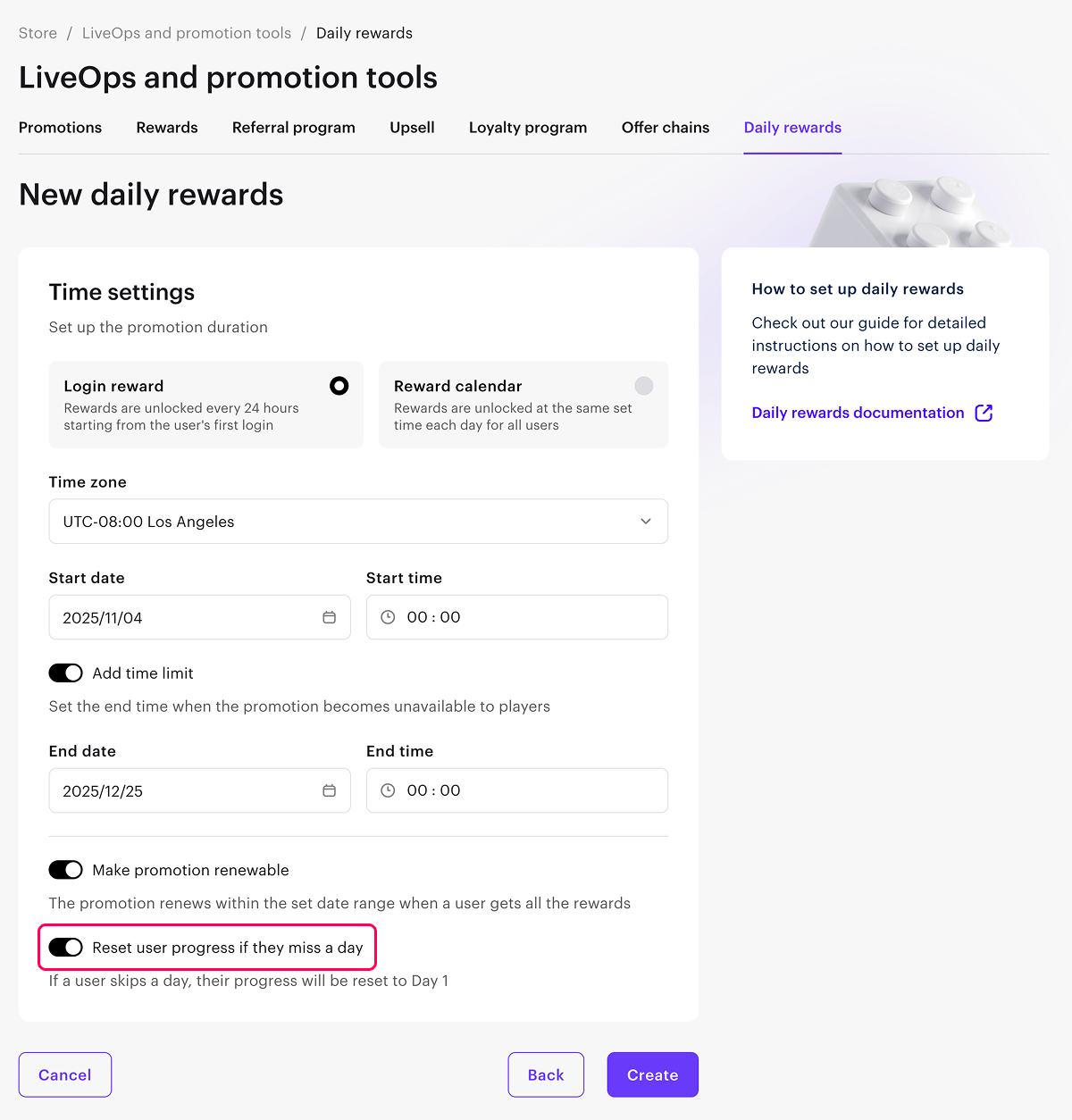 - For the Login reward type, you can configure progress reset if a user misses at least one day. To do this, set the Reset user progress if they miss a day toggle to active. If this setting is disabled, the user will resume earning rewards from where they left off when they log back in after missing a day.