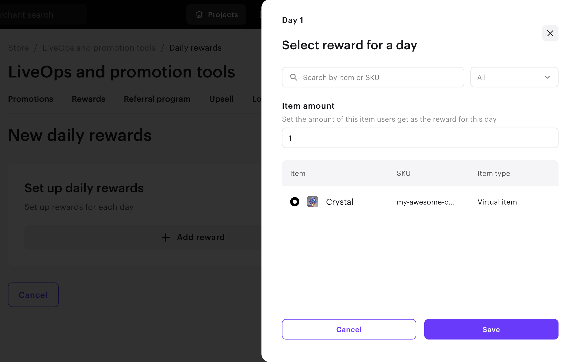 - Select an item, specify the quantity that users receive as a reward for this day, and click Save.