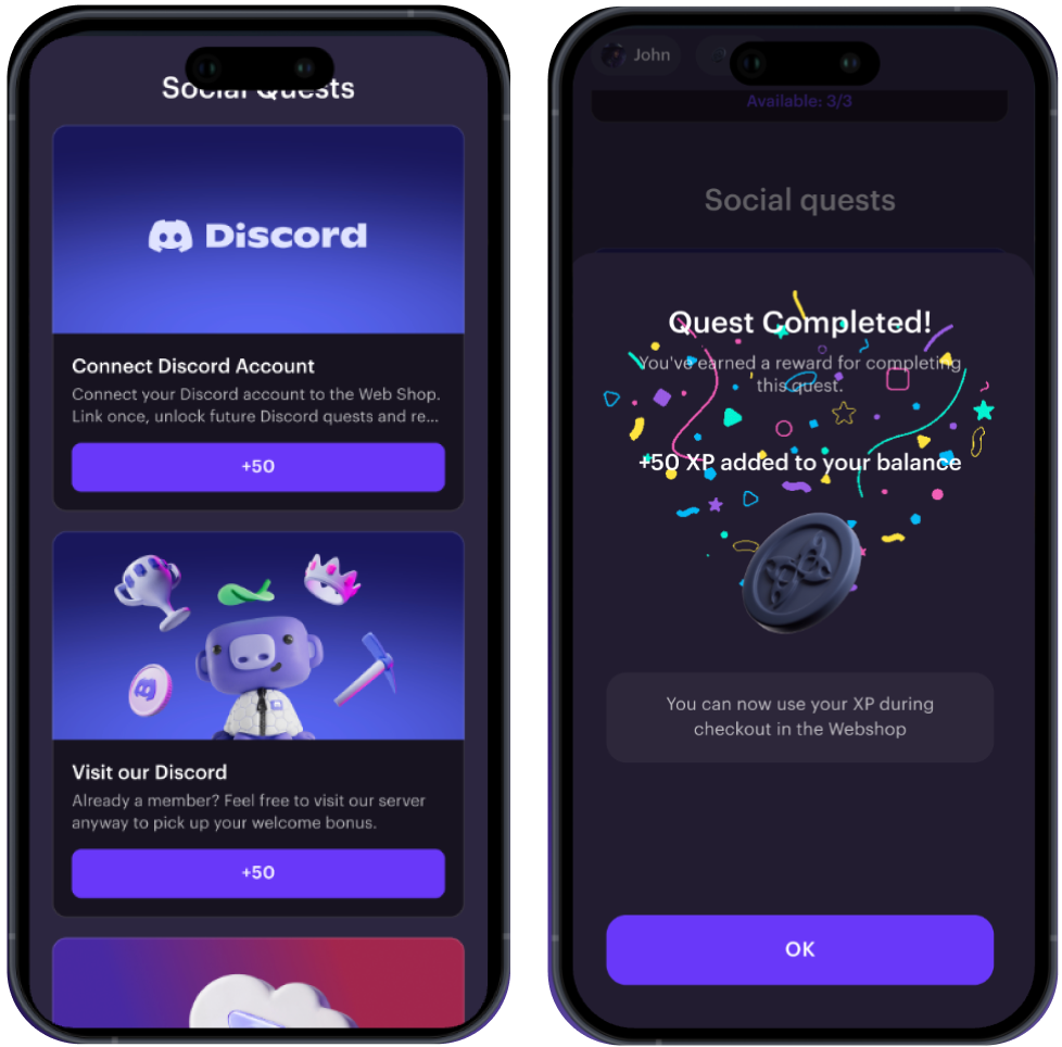 - Quests drive users from social platforms such as Discord and YouTube directly to your Web Shop or social channels, generating free, organic traffic.